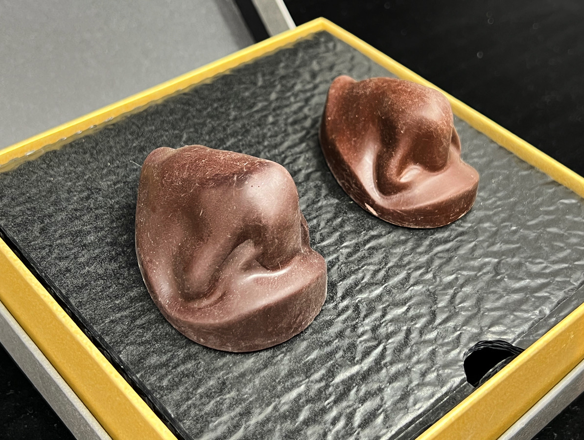 Lord Stephenson is proud of his magnificent nose! He commissioned these chocolates of him and his wife for their 50th wedding anniversary. The mould of their noses was made at their home and the master casts sent to a local chocolate maker to produce these hilarious going home presents for guests. As a bespoke item please enquire about pricing.
